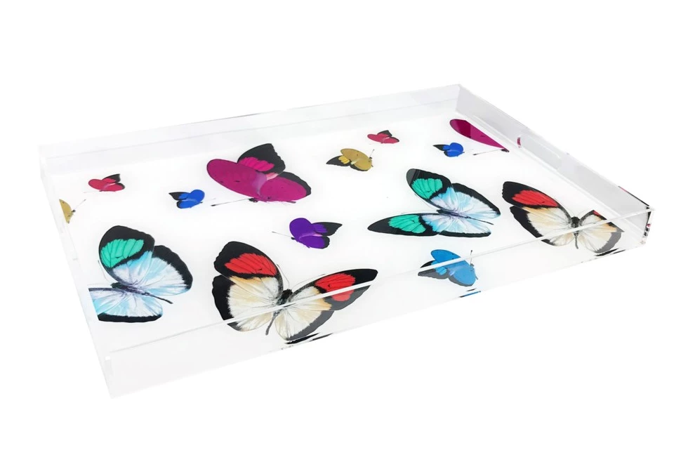 Bring the happiness of butterflies to any event. This lucite colorful tray lets you serve with a bit of fun and it has beautifully crafted beveled edges.