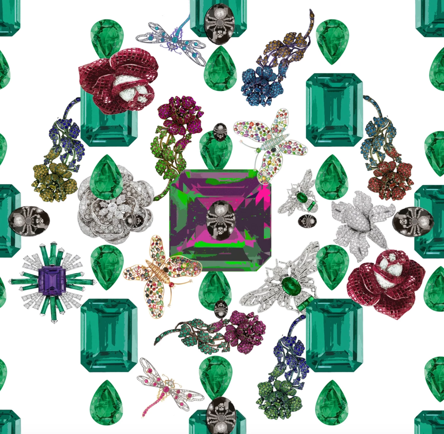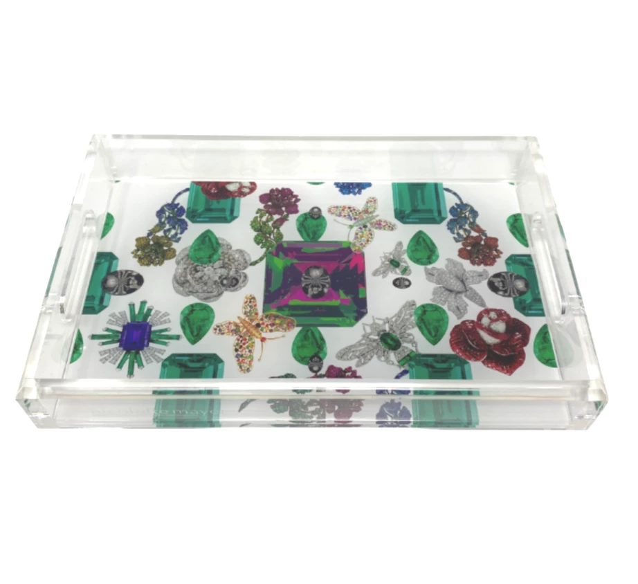 A must have for a jewelry lover. This lucite vanity tray has a pattern of beautiful emeralds with sublime jewels on a beautifully crafted beveled edge tray. Perfect as a catchall or to hold perfume bottles, hand towels or more.
