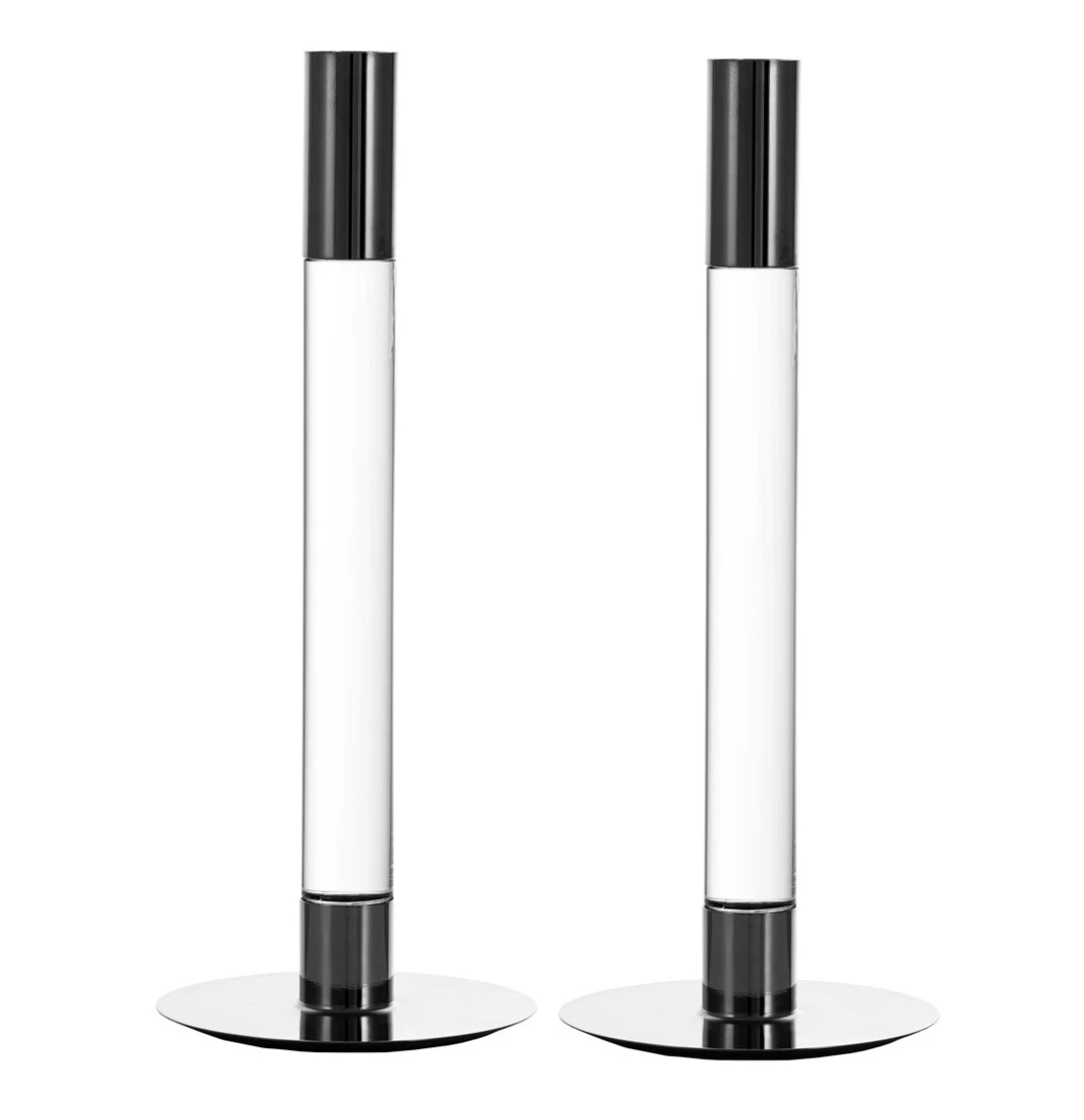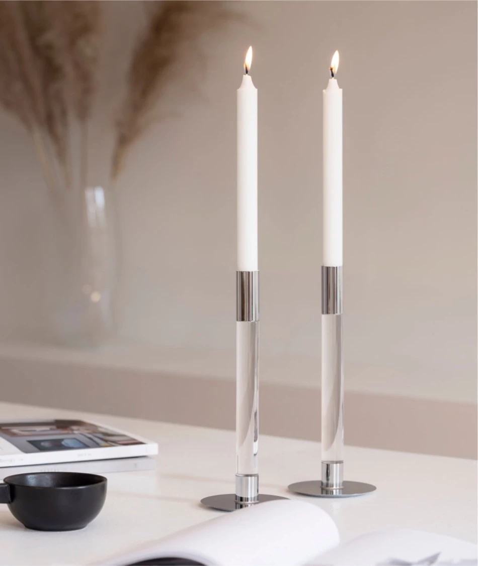 The Lumiere Candlestick has a contemporary, minimalistic design that works well in a variety of settings. The Cylindrical Glass Rod is combined with a glossy, silver base. This candle holder stands out for its incredibly pared-down precision.