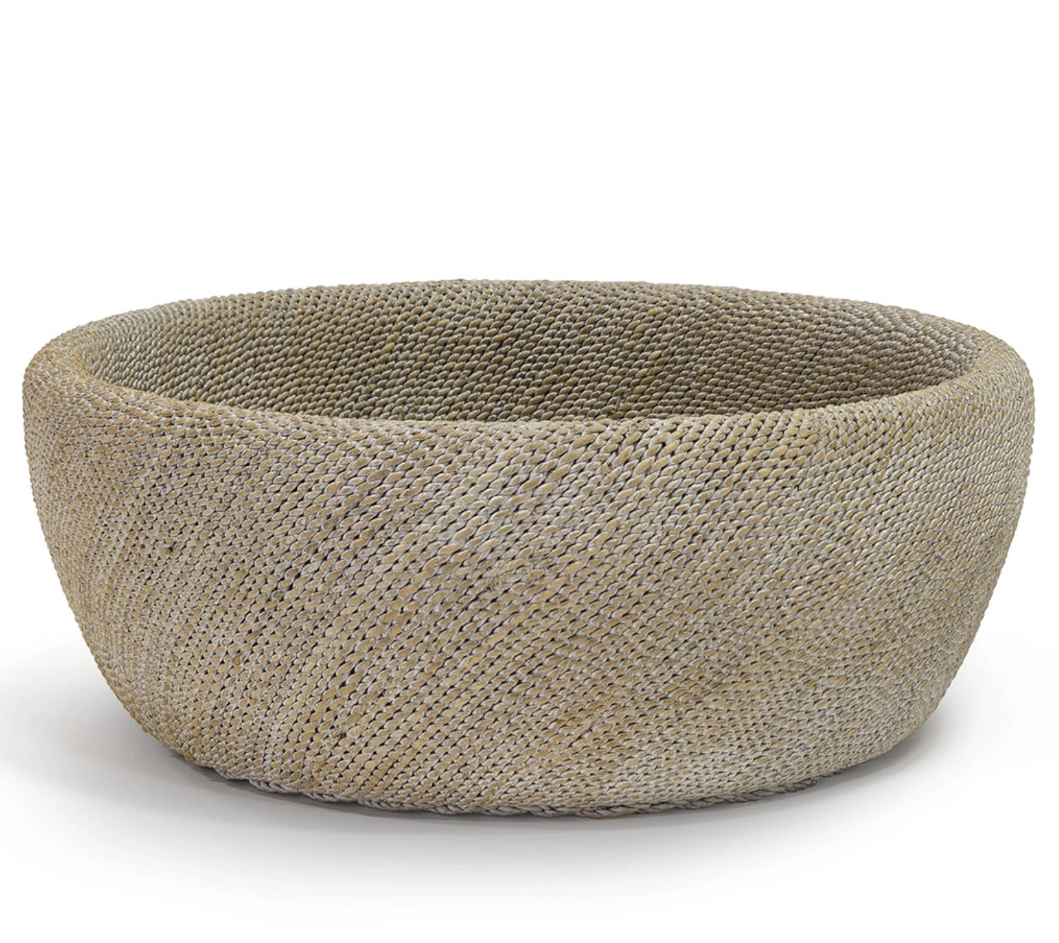 This Bowl features hand-twisted lampakanai rope in a white wash finish, perfect for a summer house.
