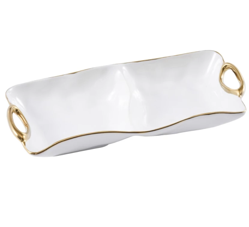 Our go to Handle Collection pieces are made of stunning white high, fired porcelain that has a smooth finish with a sophisticated gold trim. They are easy to care for and great to use daily since they are oven and dishwasher safe.