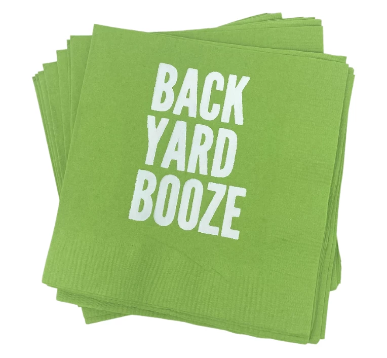 Bring the fun outdoors with our Exclusive BACKYARD BOOZE napkin set. In a lively shade of Kiwi Green they make happy hour fun in any Backyard.