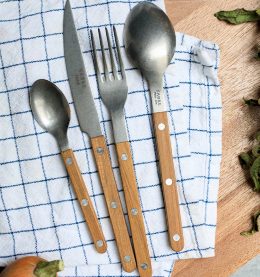 The Teak Bistro flatware collection offer a modern, fun twist on a traditional style. This French-made cutlery collection from Sabre. Their stainless steel/carbon alloy is custom-crafted to stay shiny, while the teak wood handles add a textural, natural element to your table.