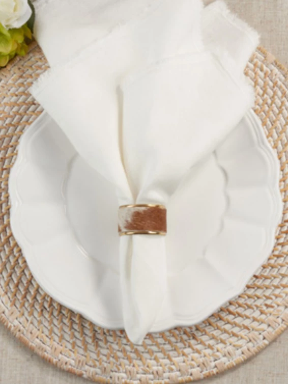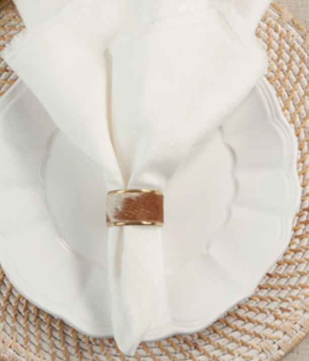 This beautiful set of rings is wrapped with cowhide in neutral shades. They are a simple design that is chic and minimal to complement any table design.