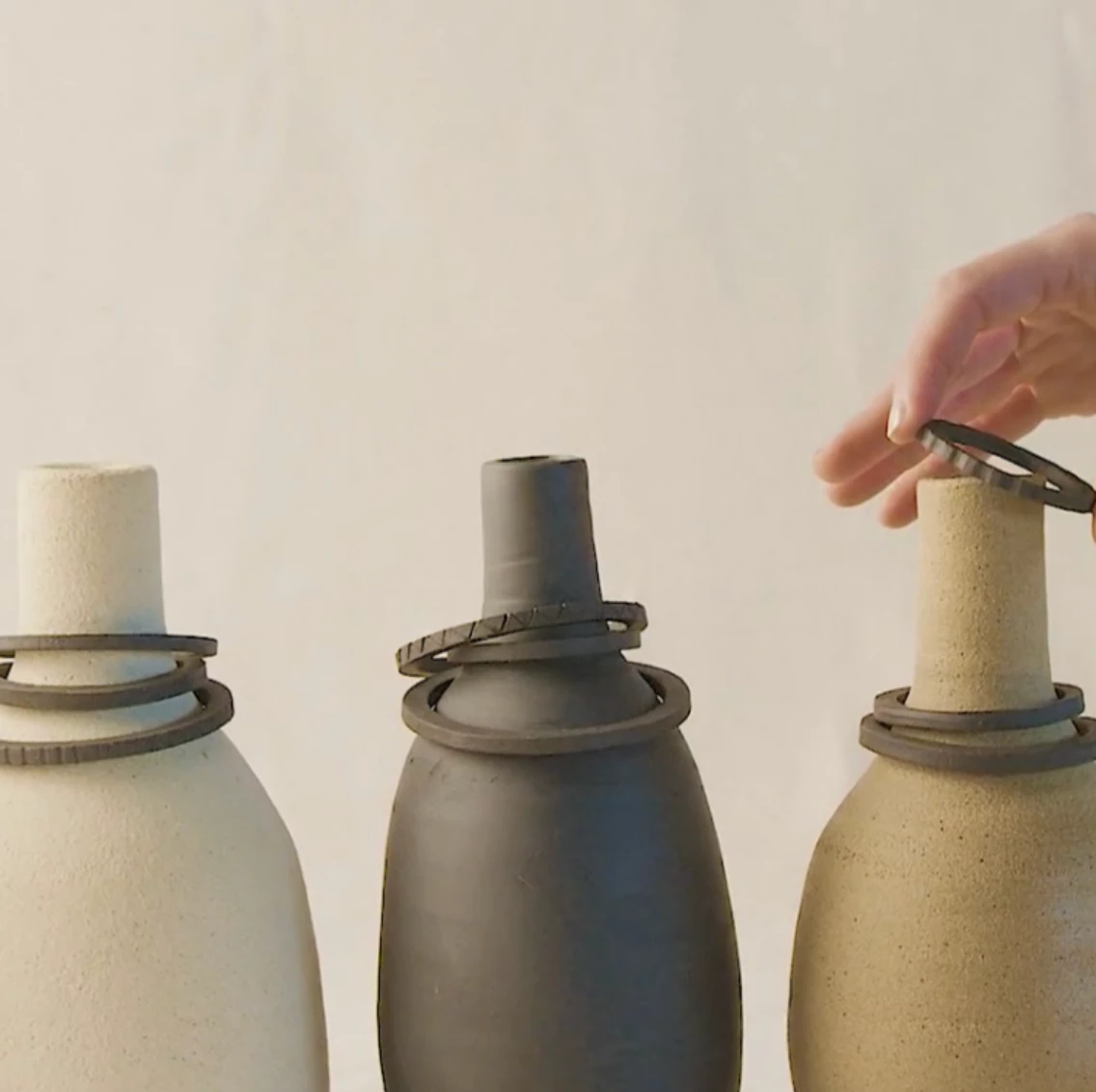 This textured vase of raw clay features 3 carefully crafted rings sitting loosely along the neck. Each ring, scalloped along the edges, are all slightly different from each other and mesmerizing to play with. Each piece is hand made by a master ceramicist.