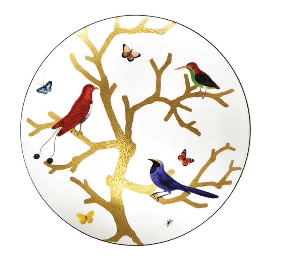 Birds of a feather flock together in this stunning dinnerware collection that was inspired by the curiosity cabinets that were so fashionable in the 16th and 17th centuries. With scenes reminiscent of Japanese prints, birds are depicted in autumnal colors and perch on stylized trees in raised gold. Handcrafted of fine Limoges porcelain in France.