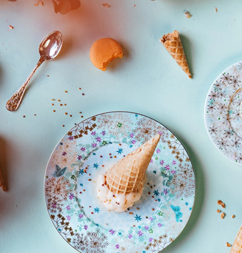 The Fèerie Dinner Collection features a design by the French artist, Michael Cailloux‘. About the collaboration with Bernardaud the artist says: ‘”For this collaboration, I wanted a festive, celestial and solar decor. An explosion of patterns like a firework … With a starry sky of small dandelion flowers, carrot flowers, clovers and wreaths of cherry blossoms. The hummingbird and the butterflies twirl, they are attracted by the light and the gold shards. A moving nature, joyful and bright.” Michaël Cailloux.