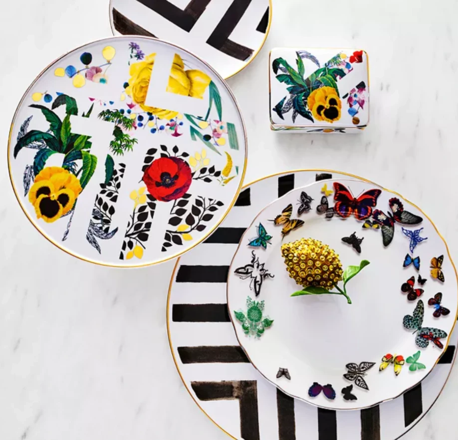In celebration of the partnership between Christian Lacroix and prestigious porcelain makers, Vista Alegre, these whimsical dessert plates are adorned with magenta dahlias, crimson poppies, and buttercup yellow pansies that mingle with lush vegetation and immaculate stripes.