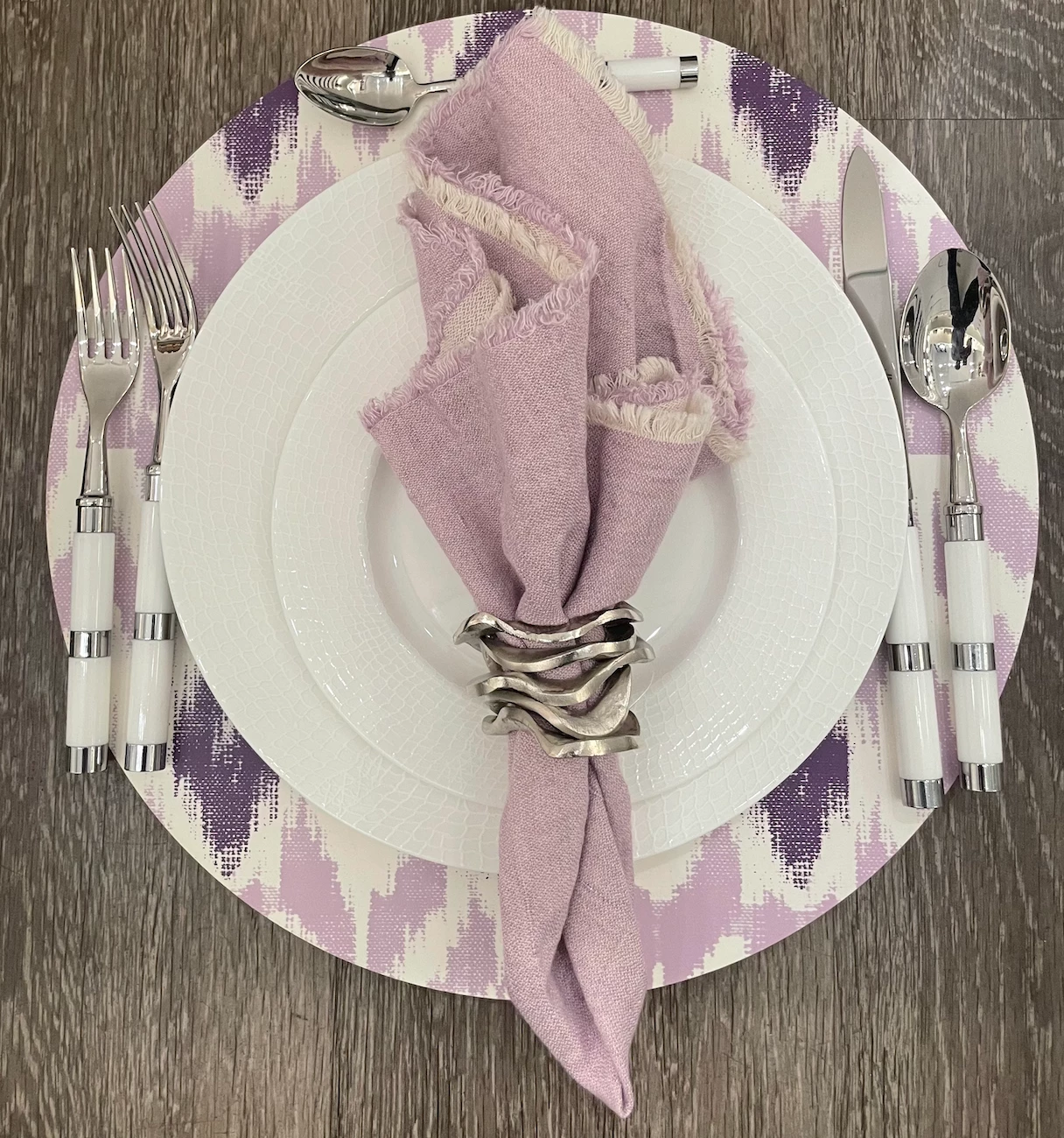 These new Ikat design placemats are printed on a wooden placemat with a cork backing and will make your table beautiful at any meal . Shown in photo with our washed fringe napkin