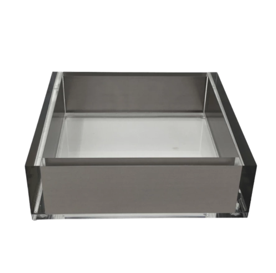 An elevated look for any cocktail table or happy hour. This acrylic holder has a pretty brushed silver edge.