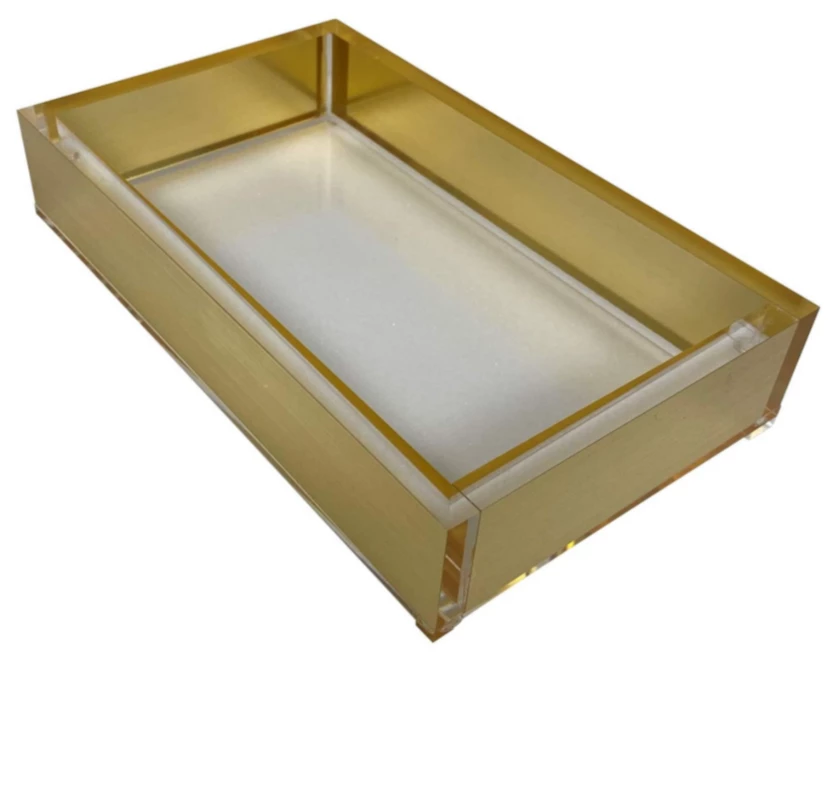 An elevated look for holding guest towels in your restroom. The holder is acrylic with a brushed gold edge.