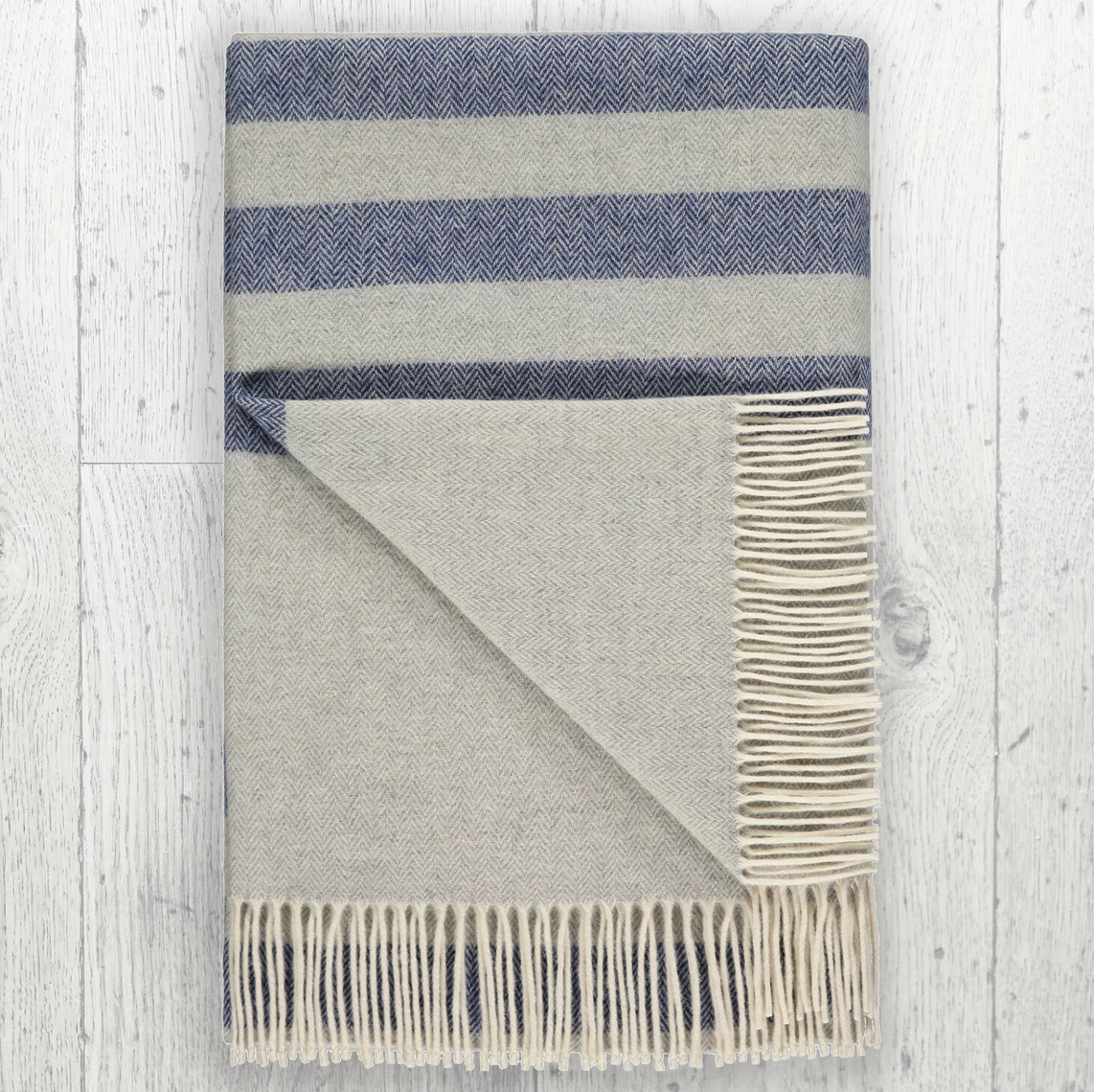Beautifully soft large lambswool throw using a traditional herringbone weave. Piper has the air of a traditional ticking stripe in a grey / midnight palette. Perfect for a relaxed nautical living space.