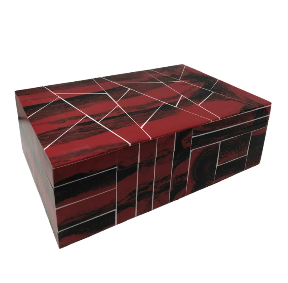 Enjoy the Spence Box, a hand crafted decorative box with a fabric lining & removable lid. Made from red resin tiles that are set in a geometric pattern.