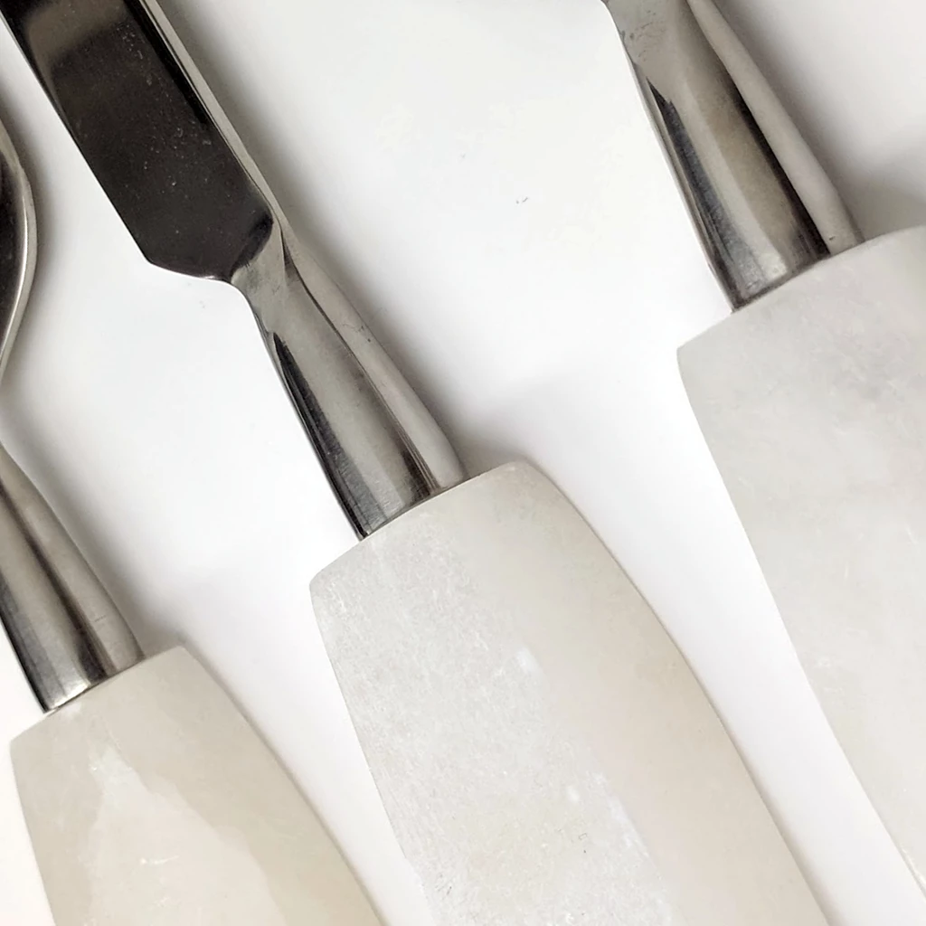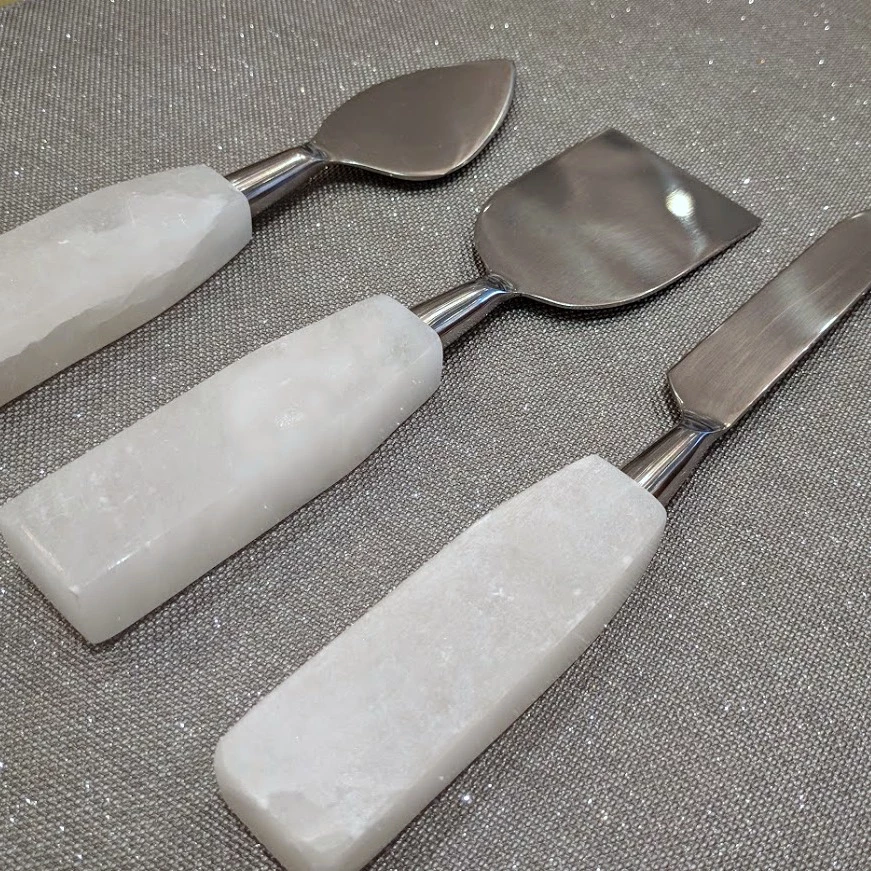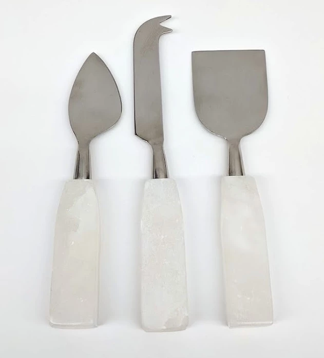 The cheese knives seem to go with everything! Opaque white alabaster stone & stainless steel, they are simple and attractive cheese knives. Three piece set.
