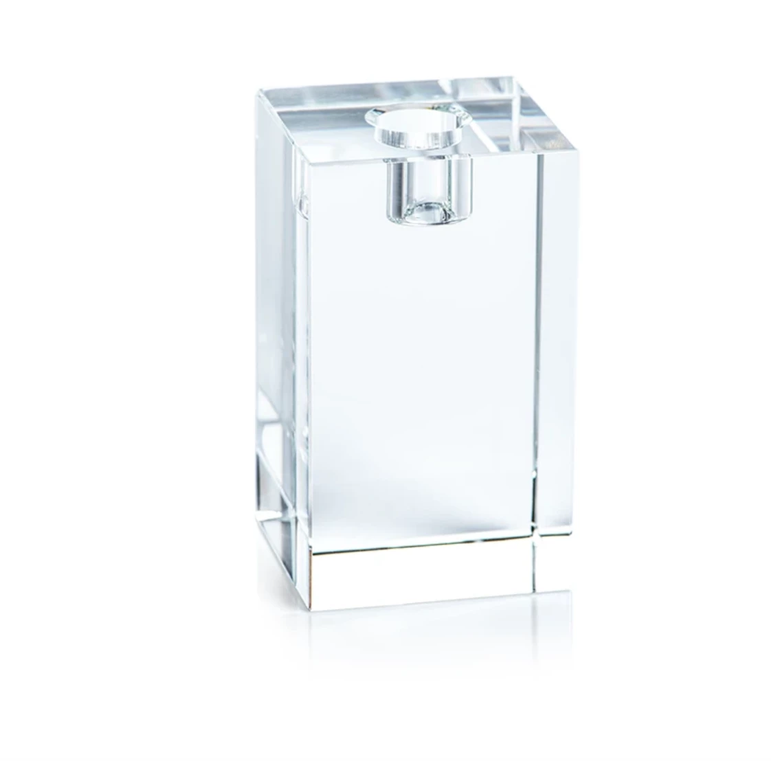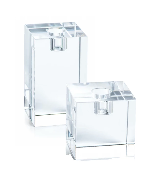 A contemporary style with this simple but elegant taper candle holder set, featuring a sleek clear clean design we can t help but adore. The beauty and clarity of the glass can easily be incorporated into any setting. Fill with any taper candles to complete the look.
