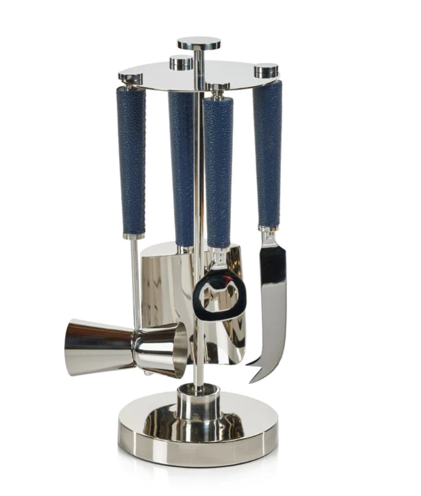 The Laguna Collection has a grouping of bar friendly items made of nickel and navy leather wrapped detailing. The Tool Set is the perfect accessory for any bar.