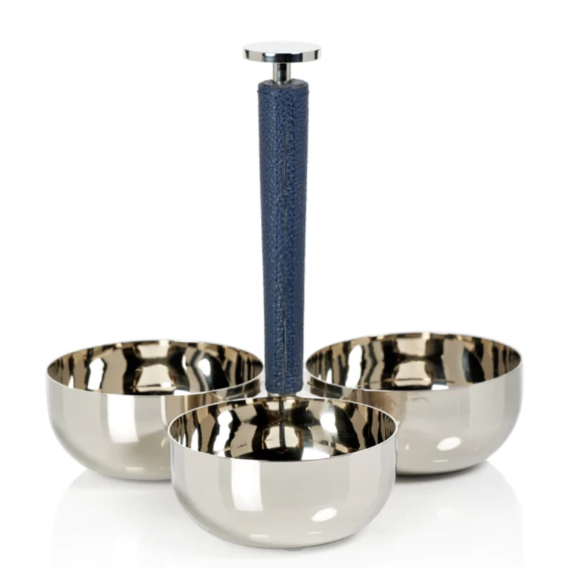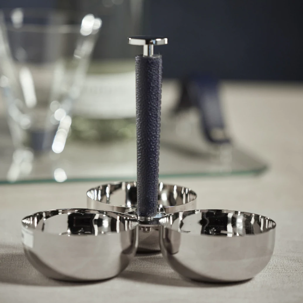 The Laguna Collection has a grouping of bar friendly items made of nickel and navy leather wrapped detailing. The condiment bowl is perfect for serving nuts on a bar or candy.