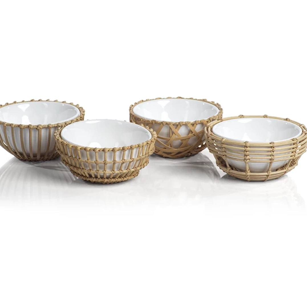 A mix of pretty wicker encases these charming ceramic bowls. Each bowl has a different design and they are wonderful for dips and sauces. We are unable to accept specific design requests.